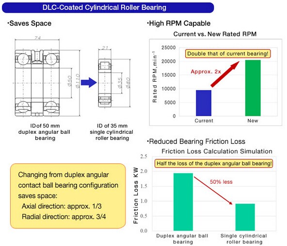 This new bearing comes with a roller-bearing-dedicated DLC coating that has ample delamination toughness for high-speed operations. Also, it achieves superior durability since its internal design has been optimized to suppress abnormal wear that can cause slipping even in usage conditions that have a pronounced tendency toward slippage and that have poor lubrication conditions as well as high speeds and light loads.