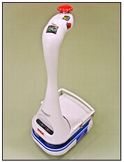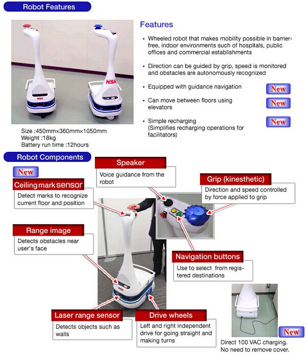 The previous robot was such that the user would follow the robot's voice guidance, and the user would also provide feedback to the robot regarding the direction they wish to proceed by controlling the directional grip on the robot. The robot would then guide the user to the destination while avoiding obstacles. This latest robot is now capable of automatically guiding users to the destination selected by the user, although the user still provides feedback to the robot through the grip. For example, the force that the user applies to the grip controls the speed of the robot and the robot will come to a gradual stop should the user release the grip.