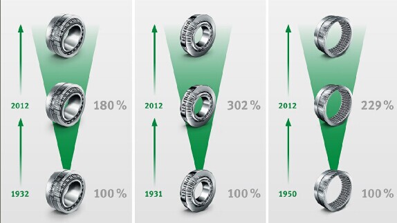 By using new production technologies for rolling bearings, Schaeffler is able to optimise the contact faces between rolling elements and raceways. As a result of increased raceway accuracy and more uniform surfaces, there is also a significant reduction in the stress conditions present on the rolling elements and raceway under the same load conditions. This produces a higher dynamic load rating, a longer nominal rating life, less friction and lower bearing temperatures, as well as a reduction in the strain placed on the lubricant. As a result of reduced friction, there is a simultaneous increase in the energy efficiency of the bearings, while energy consumption and operating costs are also reduced.