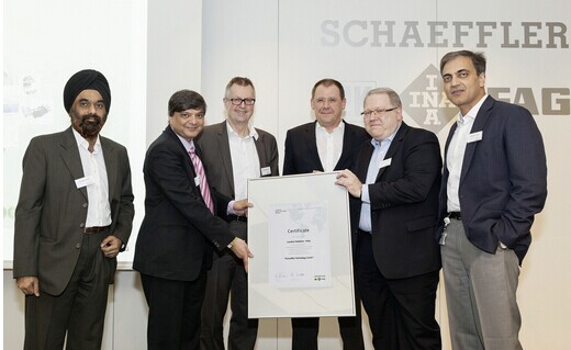 Robert Schullan, member of the Executive Board/CEO Industrial (3rd from left), Uwe Hartmann, member of the Region Management Board Europe, Middle East, Africa and India (4th from left) and Karlheinz Lindner, VP, Schaeffler Technology Center (2nd from right) present the certificate to representatives of Schaeffler India, from left: Sarabjit Singh, president, Sales and Marketing Industrial, Rajendra Anandpara, president Industrial and Dharmesh Arora, CEO, Schaeffler India.