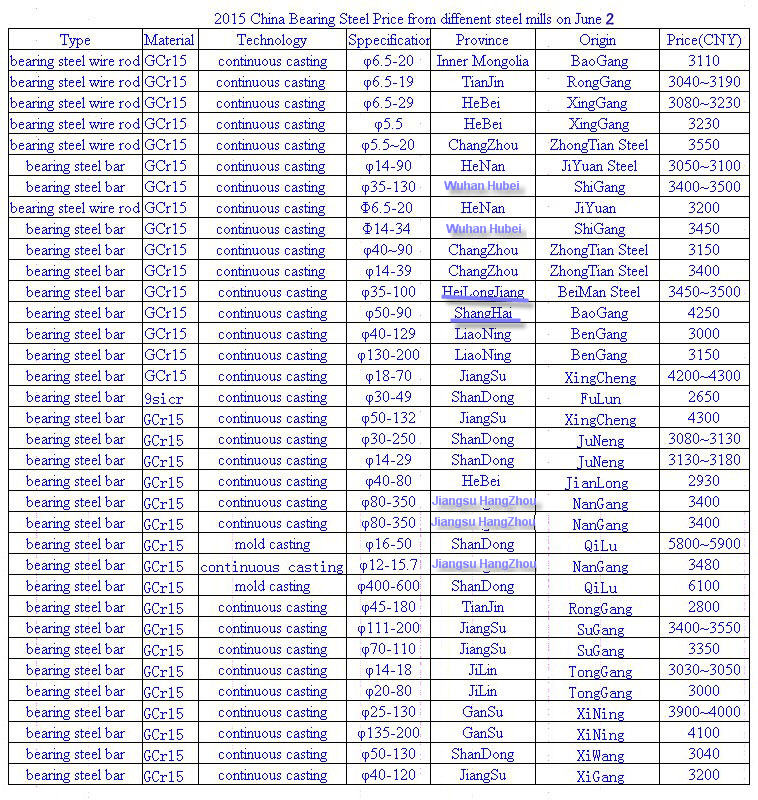 2015 China Bearing Steel Price from diffenent steel mills on June 2