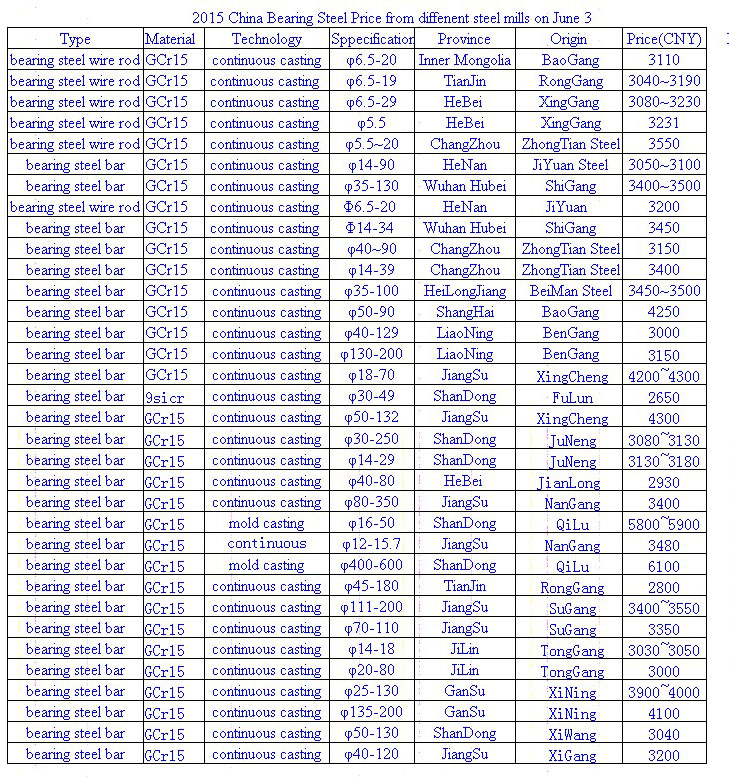 2015 China Bearing Steel Price from diffenent steel mills on June 3