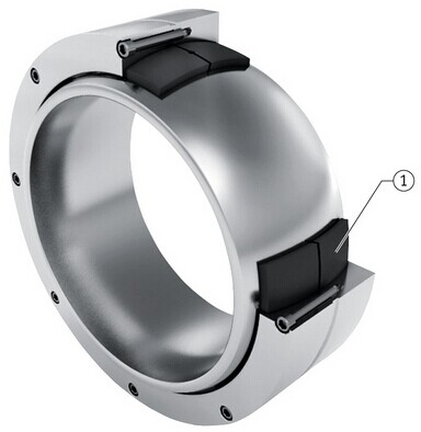 ELGES large spherical plain bearings with a sliding layer made from glass fiber-reinforced plastic (GRP) and PTFE: The sliding layer (1) of the GE..-DF large spherical plain bearing series can be optimally relubricated, which extends the operating life.