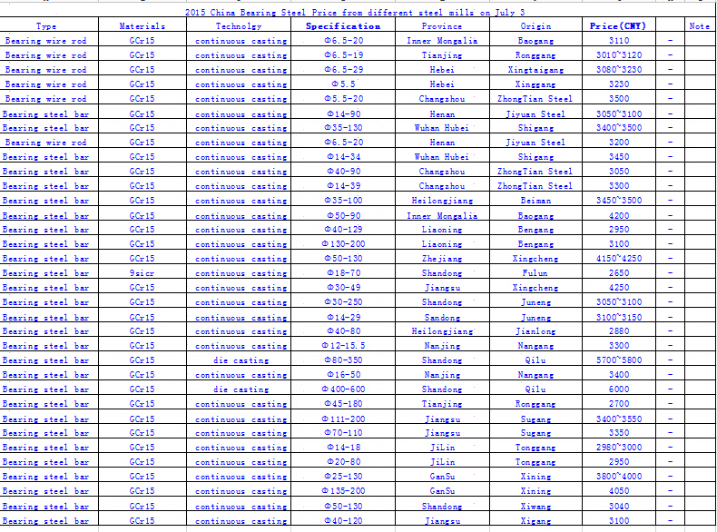 2015 China Bearing Steel Price from different steel mills on July 3