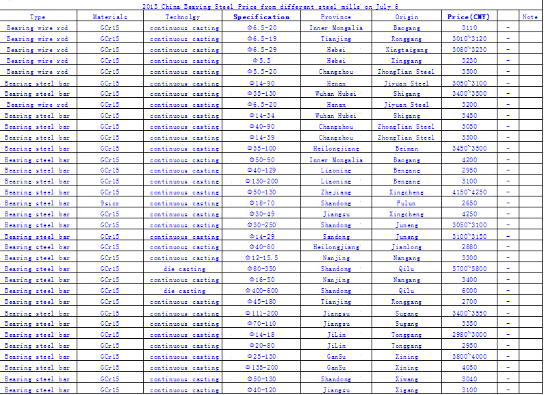 2015 China Bearing Steel Price from different steel mills on July 6