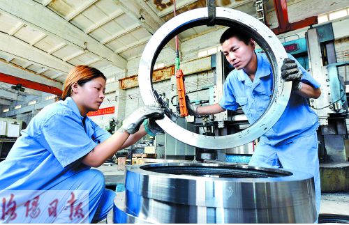 Yesterday, employees were measuring the height of the turntable bearing parts at the production workshop of Luoyang Longda Bearing Co., Ltd.