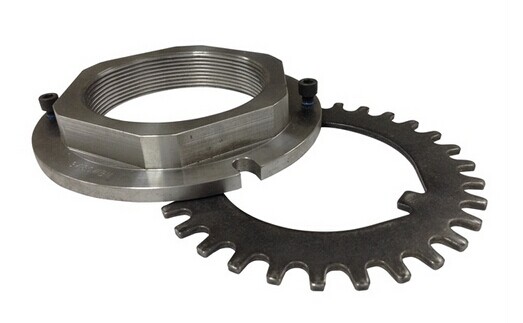 The two-piece SKF spindle nut locking system includes a hardened internal tab lock washer and a forged precision-machined flange nut – a combination that meshes with precision-formed threads to provide increased strength.