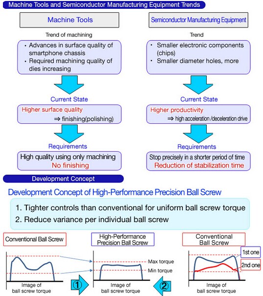 Since the torque of this new ball screw is more stable, it will now take less time to stabilize positioning, which in turn makes it possible to improve the productivity of semiconductor manufacturing equipment.