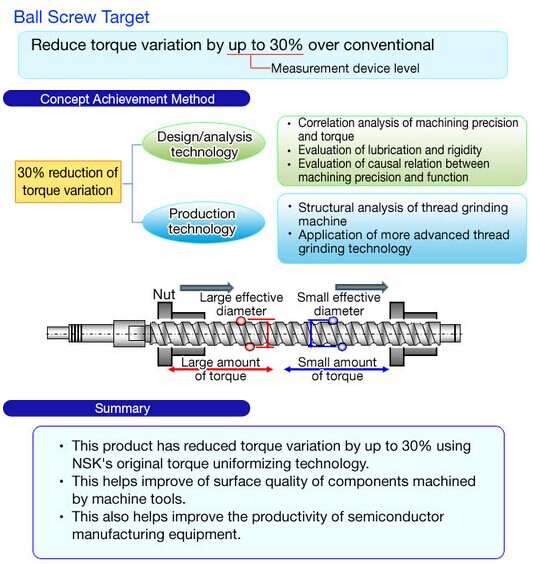 NSK Ltd. (NSK; Headquarters: Tokyo, Japan; President and CEO: Toshihiro Uchiyama) today announced that it is releasing a high-performance precision ball screw based on new technology designed for machine tool high-performance ball screws that it announced in October 2014. This technology features a huge improvement in ball screw motion control. NSK will launch this new product in October 2015 targeting 2 billion yen in global sales in 2018.