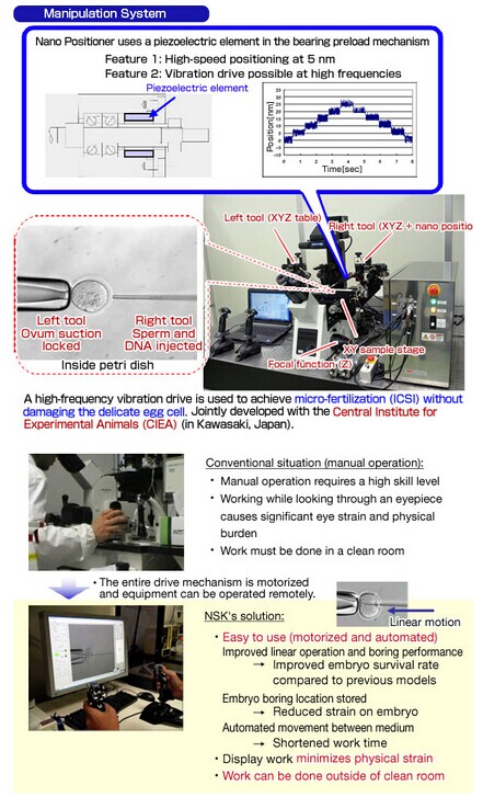 NSK's manipulation system is composed of a microscope and a 3D (XYZ) table equipped with a tool for manipulating micro size test samples such as cellular material. Such systems are very common in the medical, biotechnology, semiconductor and electronics industries. In 2008, NSK developed a high-precision, easy-to-use manipulation system by combining precision positioning drive technology with state-of-the-art image processing technology. Later, working in cooperation with Japan's Central Institute for Experimental Animals, NSK ran a variety of tests on the system and, in 2014, was successfully in achieving micro-fertilization of an experimental animal. The system was adopted by the Central Institute for Experimental Animals for its improved operational efficiency, more compact design, and improved automation.