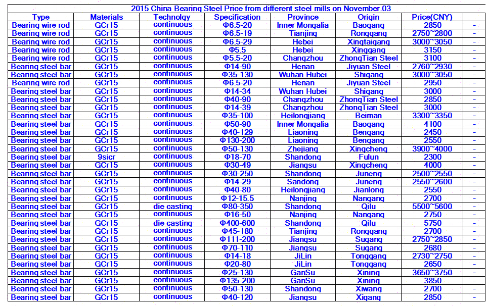 2015 China Bearing Steel Price from different steel mills on November 03