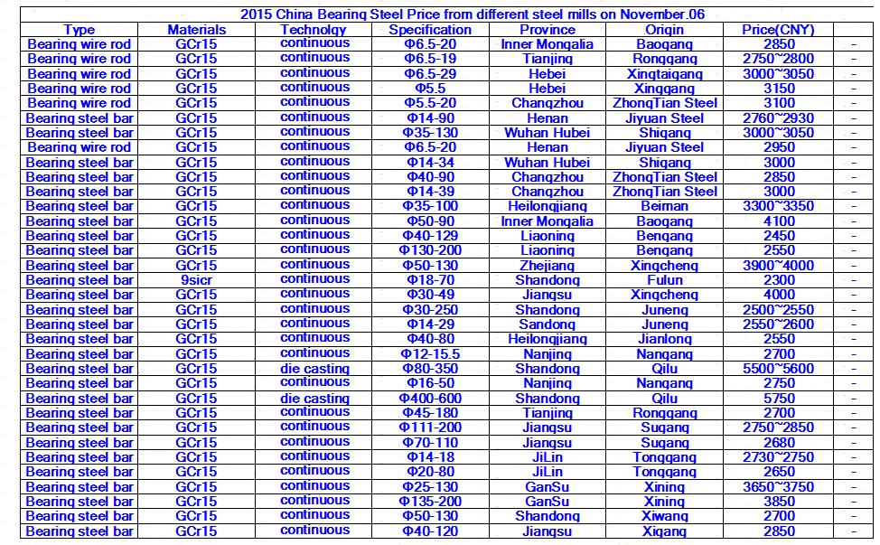 2015 China Bearing Steel Price from different steel mills on November 06