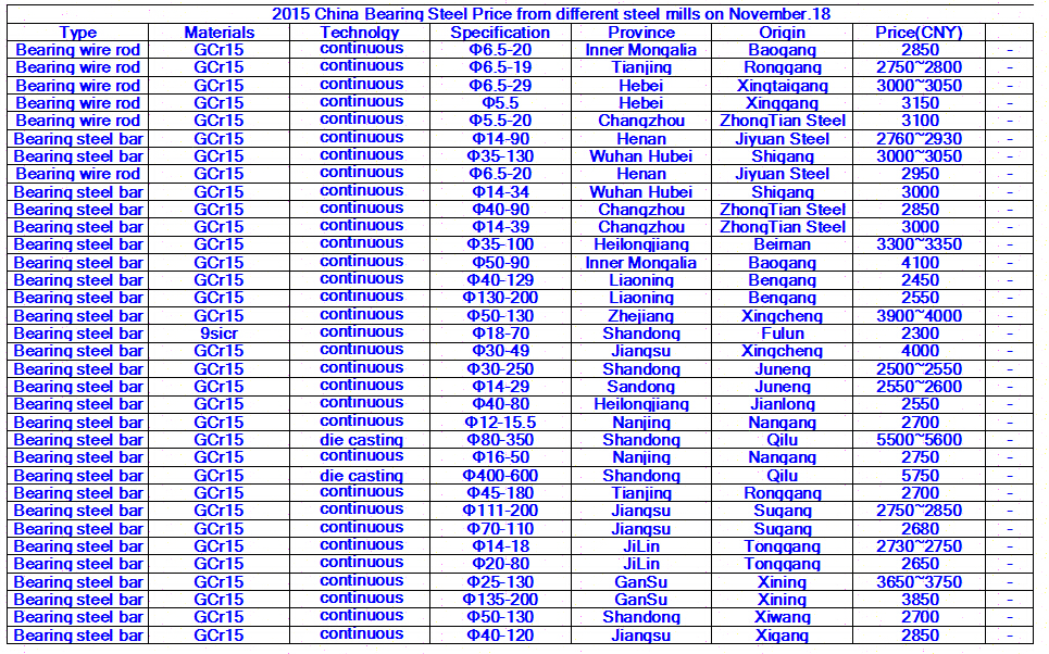 2015 China Bearing Steel Price from different steel mills on November 18