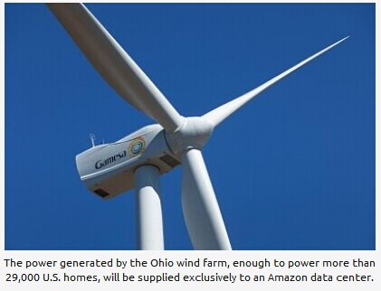 The power generated by the Ohio wind farm, enough to power more than 29,000 U.S. homes, will be supplied exclusively to an Amazon data center.