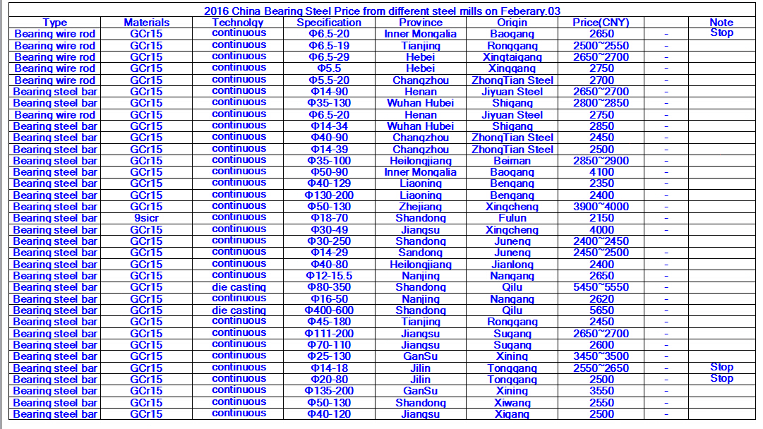 2016 China Bearing Steel Price from different steel mills on Feberary.03