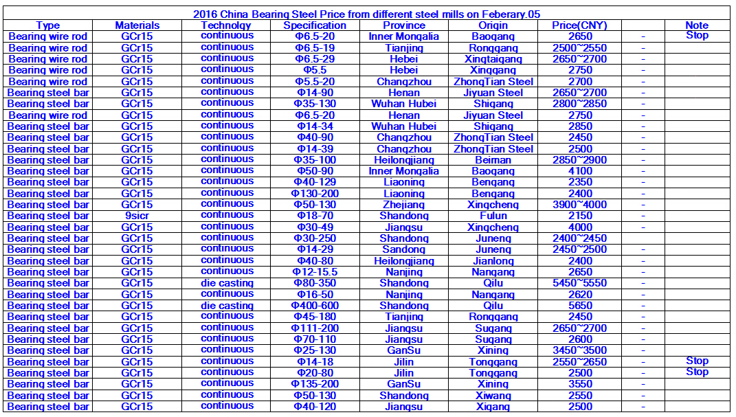 2016 China Bearing Steel Price from different steel mills on Feberary.05