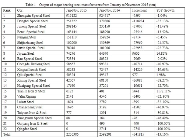 Seen from Table 1 that the top three for bearing steel output from January to November 2015 are still Zhongxin Special Steel (Xinye Steel and Xingcheng Special Steel), Dongbei Speical Steel and Juneng Steel. (for Sha Steel, only the yield of Huai Steel is counted). Among these 22 companies, only one reported increase in the crude bearing steel ouput, while 19 companies fell, 2 out of production.