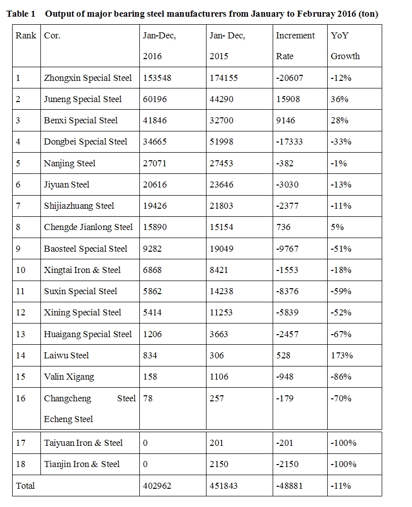 According to a random investigation conducted by the writer on the output of several large domestic bearing steel mills this month, Xingcheng Special Steel, Juneng Steel, Benxi Steel and Dongbei Special Steel had relatively steady growth in steel output, while Baosteel Special Steel had a decrease in yield for being focused on lean product development. Wherein, the north and northeast markets are dominated by Dongbei Special Steel and Shijiazhuang Steel, East China market is dominated by Xingcheng Special Steel, Benxi Steel and Baosteel Special Steel and the Central China market is dominated by Xinyegang Steel. The details are shown in the table below: