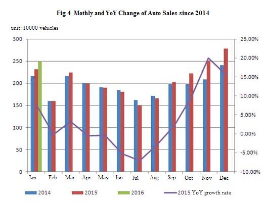 According to the statistical analysis of China Association of Automobile Manufacturers, the output and sales of automobiles decreased sharply over the previous month yet decreased slighlty YoY in February. From January to February, the output and sales of automobiles were higher YoY. The growing rate of passenger vehicles slowed over the previous year while the decline range of commercial vehicles narrowed. In February, the auto production was 1,611,800, with a decline of 34.43% MoM, 1.31% YoY; the sales was 1,580,900, with a decline of 36.94% MoM, 0.86% YoY. From January to February, the the output and sales of automobiles were 4.0691 million and 4.0869 million, up by 3.74 % and 4.37 % YoY.
