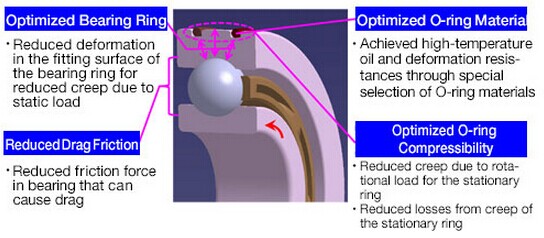 NSK's Creep-Free™ bearings are anchored to the case by employing an O-ring on the outer surface of the outer race and, as such, are effective in preventing rotational load creep.