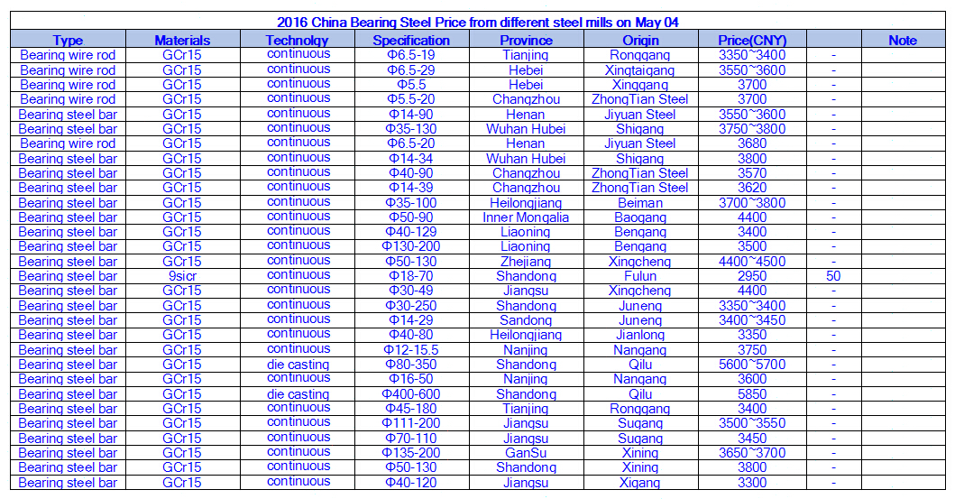 2016 China Bearing Steel Price from different steel mills on May 04