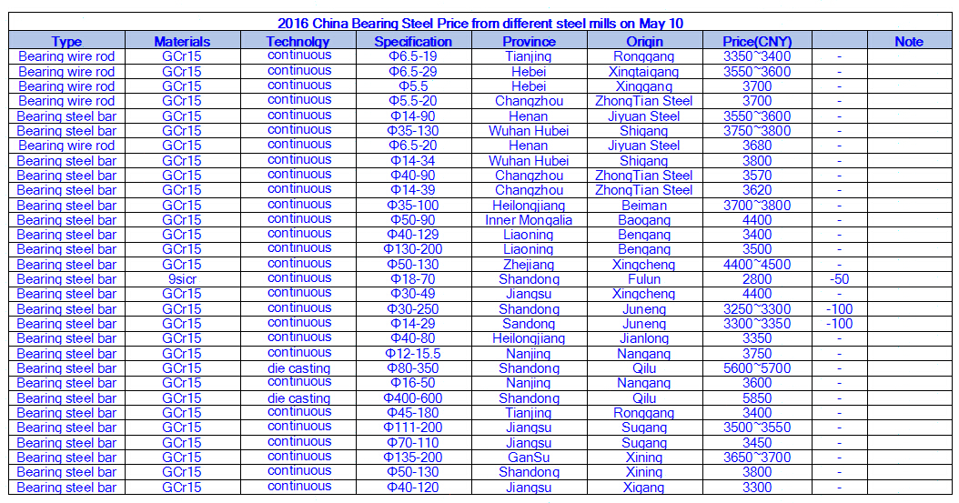 2016 China Bearing Steel Price from different steel mills on May 10