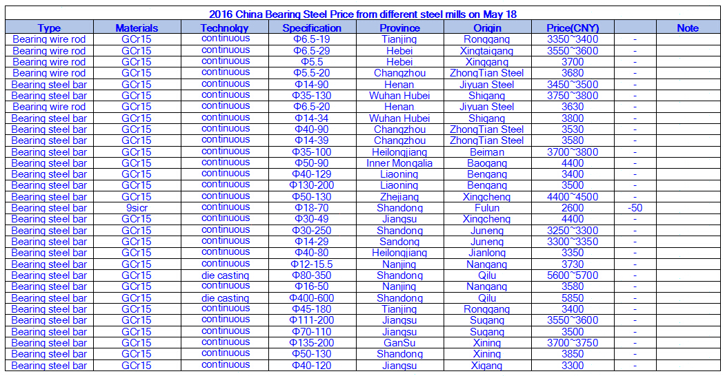 2016 China Bearing Steel Price from different steel mills on May 18