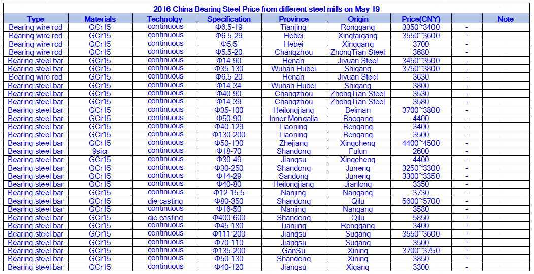 2016 China Bearing Steel Price from different steel mills on May 19