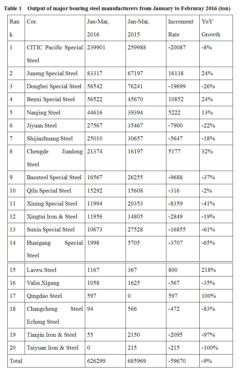 Seen from Table 1 that the top three for bearing steel output from January to March 2016 are still Zhongxin Special Steel (Xinye Steel and Xingcheng Special Steel), Juneng Steel and Dongbei Speical Steel. (for Sha Steel, only the yield of Huai Steel is counted). Among these 20 companies, 6 reported increase in the crude bearing steel ouput, 13 companies reduced output and 1 was out of production. Juneng Steel, Benxi Steel, Nanjing Steel and Jianlong Steel all increased the putput sue to the improvement in profitability.