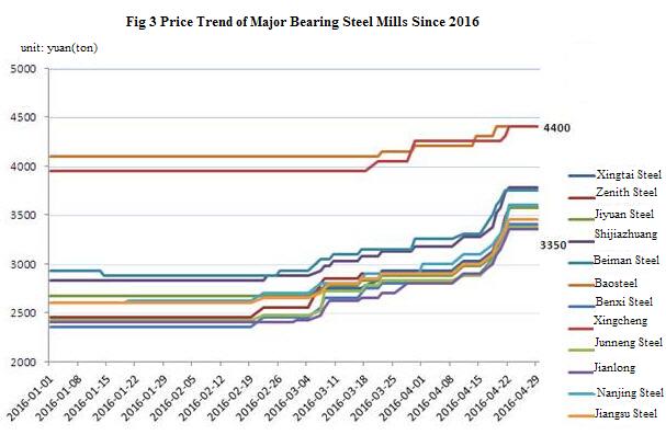 Domestic bearing steel mills pulled up the ex-factory prices sharply in April. BaoSteel Special Steel and Xincheng Special Steel increased their price by 200 yuan/ton while Benxi Steel, Nanjing Steel, Juneng Steel and Zenith Steel and other steel mills pulled up the prices in the range of 500 to 600 yuan/ton, the highest in nearly 24 months.