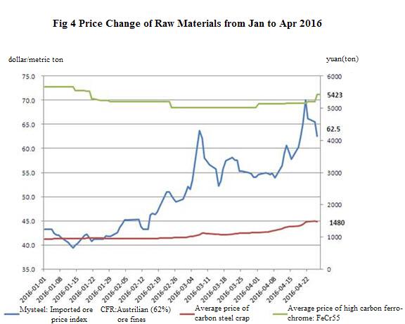 Imported ore price ran in consolidation in April, closed at 62.5 dollar/ton by the end of the month; the price of carbon steel scrap was on the rise, closed at 1480 yuan/ton by the end of the month, up by 30.74% over the previous month; the price of high carbon ferrochrome was slightly adjusted nationwide, closed at 5423 yuan/ton by the end of the month.