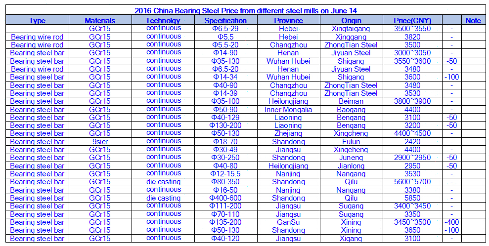 2016 China Bearing Steel Price from different steel mills on June 14