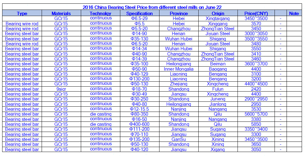 2016 China Bearing Steel Price from different steel mills on June 22