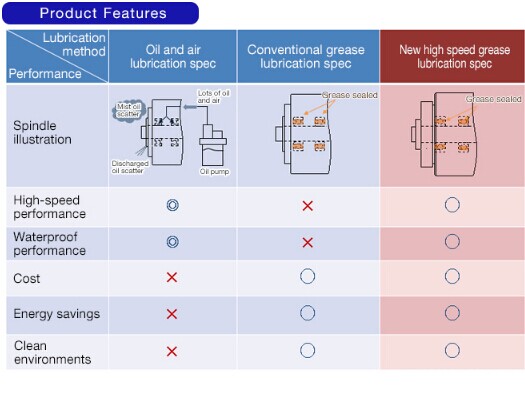* NSK improved the grease sealing method and optimized the inner structure of the spindle to develop a product that could replace oil and air lubrication applications with grease lubrication.