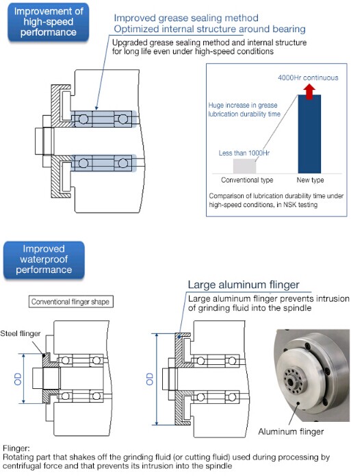 In recent years, there has been a growing need for higher speeds in grinding spindles used in the fabrication of machine tool and automobile components in order to improve production efficiency. Further, there has been a demand for measures to achieve better energy savings and cleaner plant environments. In order to satisfy these needs and demands, it became necessary to switch from the conventional approach of oil and air lubrication to grease lubrication for grinding spindles. However, when it comes to the ultra-high-speeds of grinding spindles (dmn200 x 104 above), grease lubrication poses a challenge in terms of the life of the spindle.