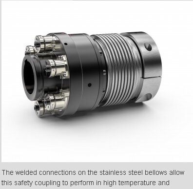 The welded connections on the stainless steel bellows allow this safety coupling to perform in high temperature and corrosive environments. While this model here is shown with a keyway, clamping rings and flange connections are also popular options. Special versions for extreme speeds are also available on request.