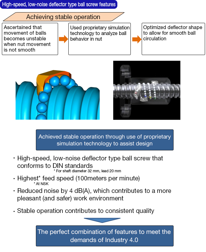 Application of NSK's proprietary high-speed, low-noise technology achieved a 4 dB(A) reduction in noise compared to conventional NSK deflector type ball screws.