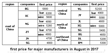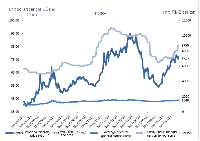 In August, the price of imported minerals fell sharply to 77.15dollars/ton. While the market price of general carbon and rust steel remained higher to 1483RMB/ton, which was increased by 3.84% comparing with last month. The price of high carbon ferrochrome up sharply and the average price was 8750RMB/ton at the end of this month. With the influence of reduced output and environmental protection ,so in September ,the materials of the bearing steel will still up.