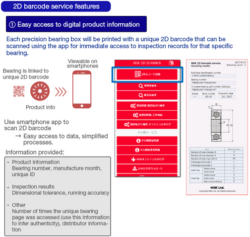 The unique 2D barcode that comes with each precision bearing, and the associated NSK cloud system, will help keep customers safe from fake and imitation products. By scanning the barcode on a bearing box, the NSK app will immediately tell the user if the product is suspected to be fake. Furthermore, the number of accesses to the unique webpage for each bearing will be tracked and displayed, allowing customers to better infer whether the product is a mass-produced imitation in an illicitly copied NSK bearing box.