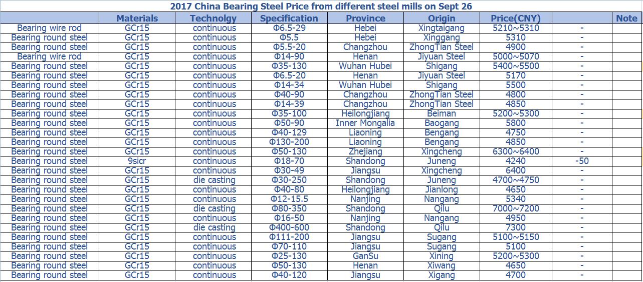 2017 China Bearing Steel Price from different steel mills on Sept 26