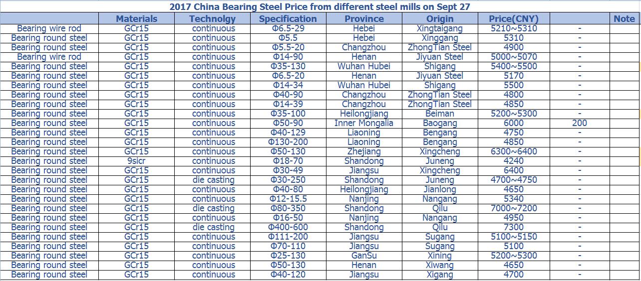 2017 China Bearing Steel Price from different steel mills on Sept 27