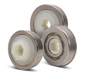 The CB-14 bearing design combines two major features that act together to reduce the metal-to-metal contact that is a common source of noise throughout a conveyor system. A nylon retainer separates and guides the balls, while a pressed-in nylon adapter eliminates any direct contact of bearing ring with conveyor shaft. An adapter flange also acts as a bearing shield to exclude contaminants.