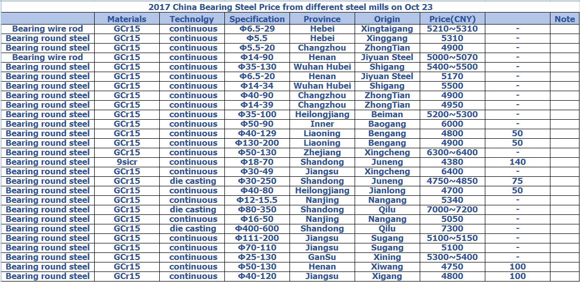 2017 China Bearing Steel Price from different steel mills on Oct 23