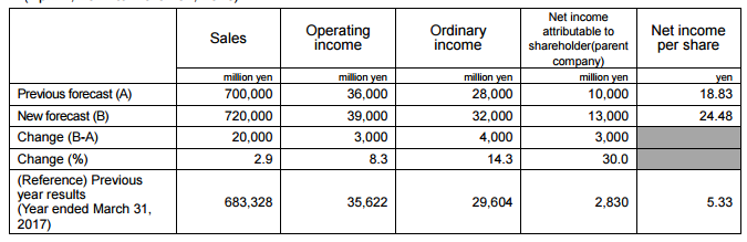 2. Revision to Consolidated Earnings Forecast for Fiscal year Ending March 31, 2018