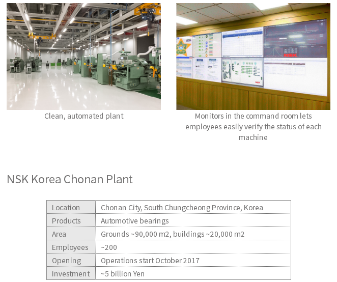 “The Chonan plant was built with the goal of creating an environmentally friendly and clean plant. The employees each independently contributed to the project to create highly reliable manufacturing facilities that meet the needs of our customers, and that can serve as a model for NSK operations worldwide.”