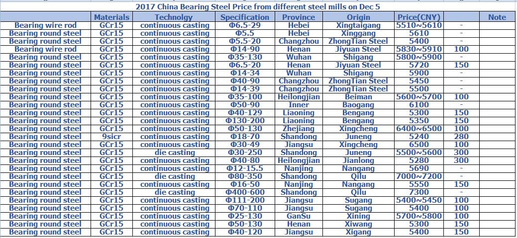 2017 China Bearing Steel Price from different steel mills on Dec 5