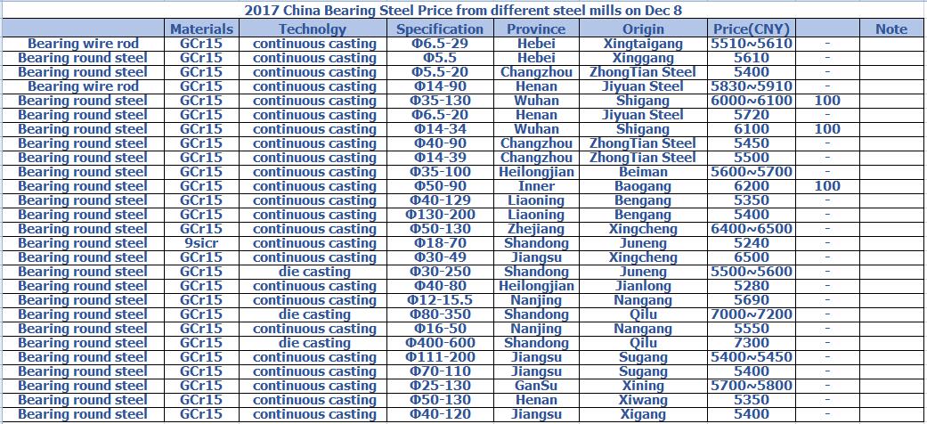 2017 China Bearing Steel Price from different steel mills on Dec 8