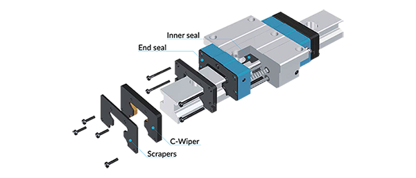 Dust protection. A dust protective C-Wiper can be mounted to the outside of the end seal, ensuring operation in environments where metal chips are spattering. After 1,000 km of operation, the C-Wiper prevented foreign substances from entering the slide unit with no damage to the end seal.