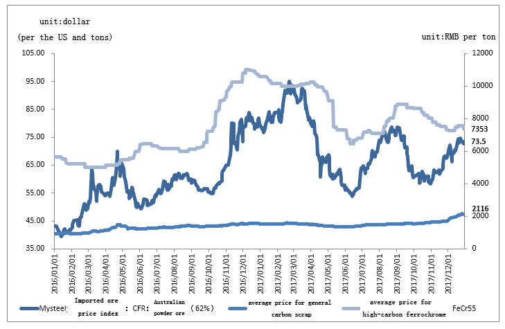 In December, the price of imported minerals fell to 73.5 dollars/ton. While the market price of general carbon and rust steel remained higher to 2116 RMB/ton, which was increased by 21.82% comparing with last month. The price of high carbon ferrochrome remain small consolidation and the average price was 7353 RMB/ton at the end of this month. So its estimate that raw material market run with pressure in January.