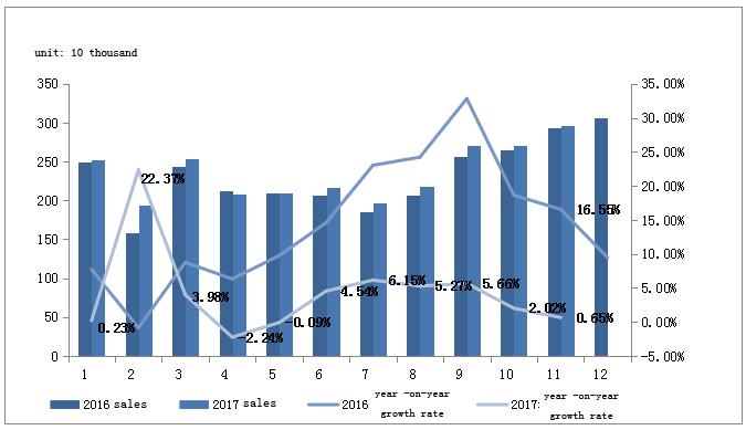 Automobile production and sales volume of November, 2017 increased than last month, but the growth rate was lower. From January to November, the year-on-year growth of automobile production and sales increased slightly compared with the previous 10 months. In Octomber, the yields of autos reach to 30,803,000 units, the result is increased by 18.69% comparing with last year, and increased by 2.31% year-on-year . Sales volume reaches to 2,957,600units, the result increased by 9.73% comparing with last year, and increased by 0.65% year-on-year . From January to November, both yields and sales volume is 25,998,800 units and 25,844,900units, increased by 3.88% and 3.59% year-on-year growth. The growth rate increased by 0.39 percentage point and 0.54 percentage point from January to Octomber.